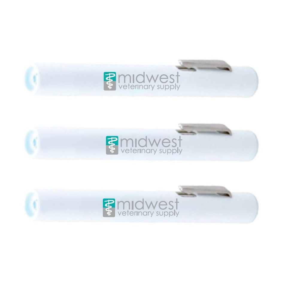 The Midwest Vet LED Pen Lights are a sleek and practical addition to any veterinary professional's toolkit. Designed to fit comfortably in your pocket, this white penlight is both stylish and functional, adorned with a silver clip and featuring the distinctive Midwest Vet logo.