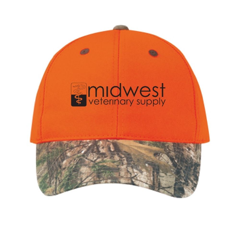 Blaze orange cap with black Midwest logo that features Mossy Oak camouflage print on the brim and closure.